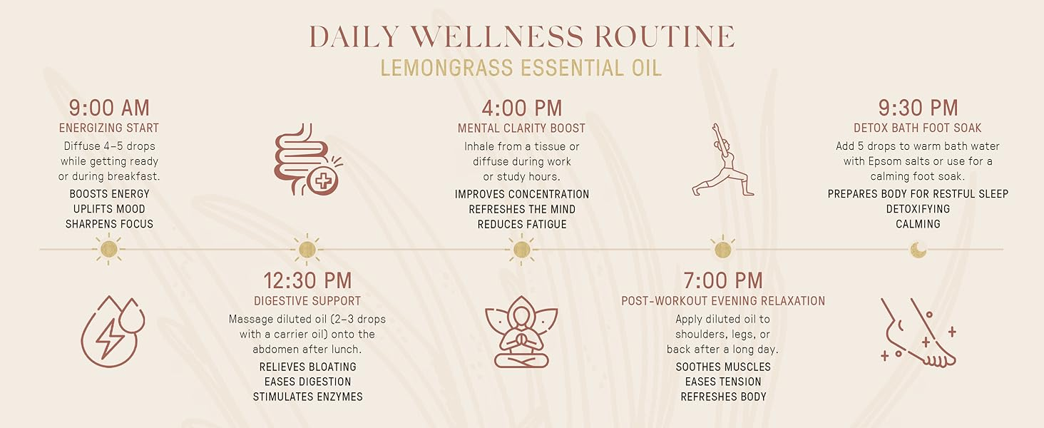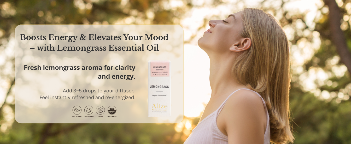 Known for its fresh, lemony scent, lemongrass essential oil is a natural mood enhancer that helps relieve stress, purify the air, and promote mental clarity when used in aromatherapy
