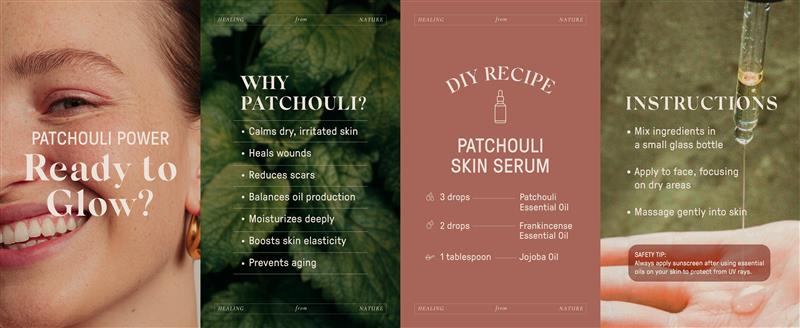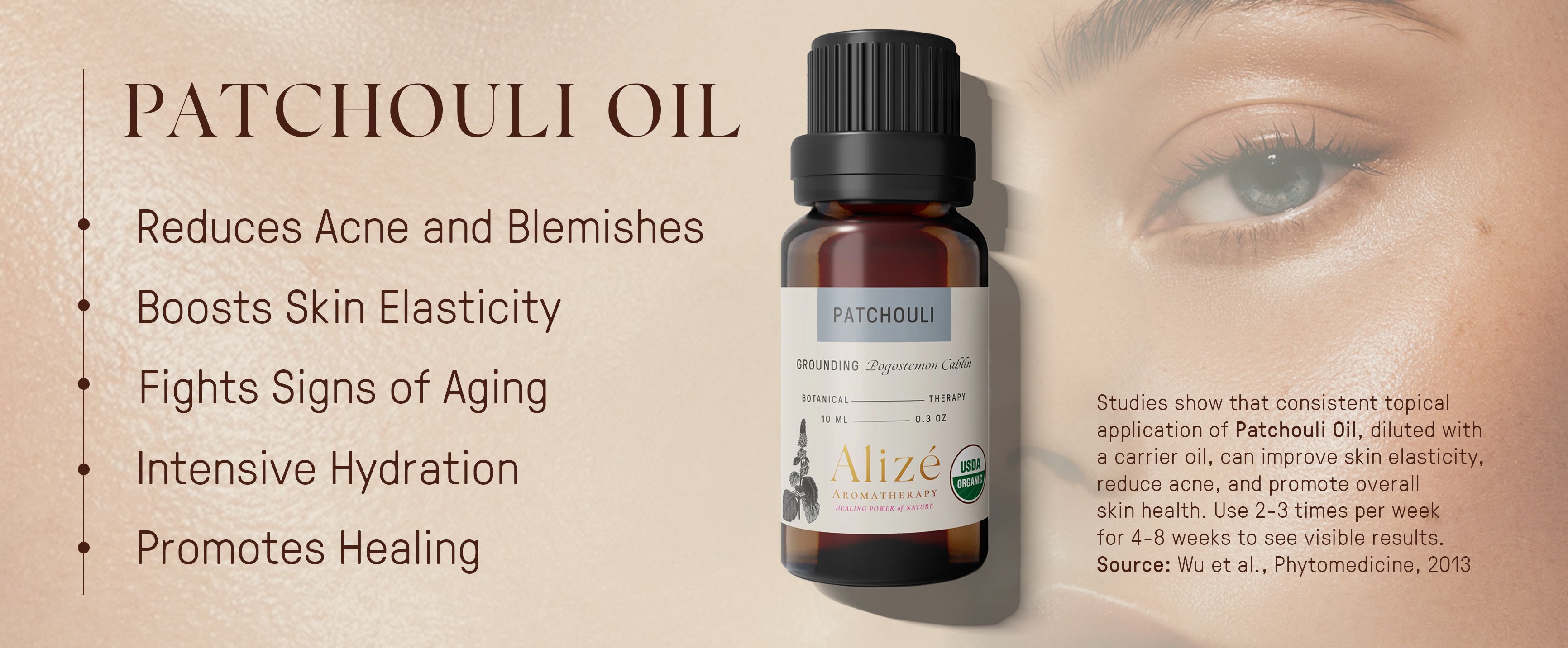 Patchouli oil soothes dryness and irritation, aids in wound recovery, fades scars, hydrates deeply, and improves skin firmness for a more youthful appearance