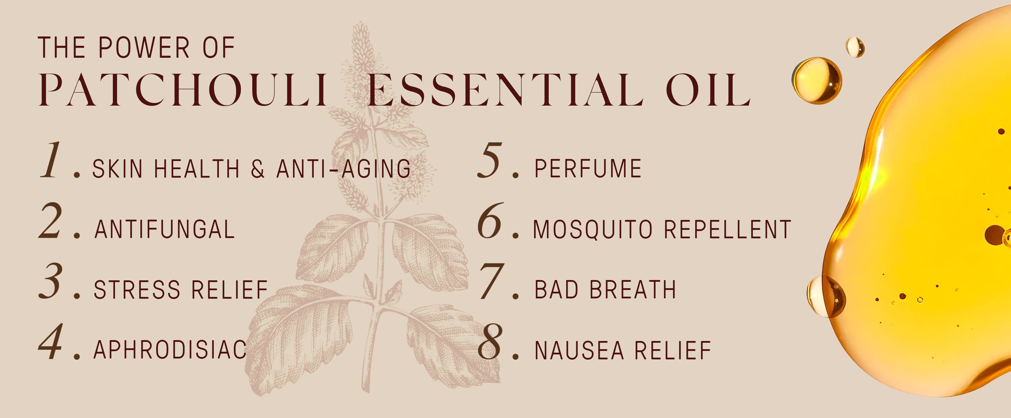 Patchouli oil promotes skin health with natural antifungal properties, offers stress relief and aphrodisiac effects, doubles as a sensual perfume, and even helps repel mosquitoes and ease nausea