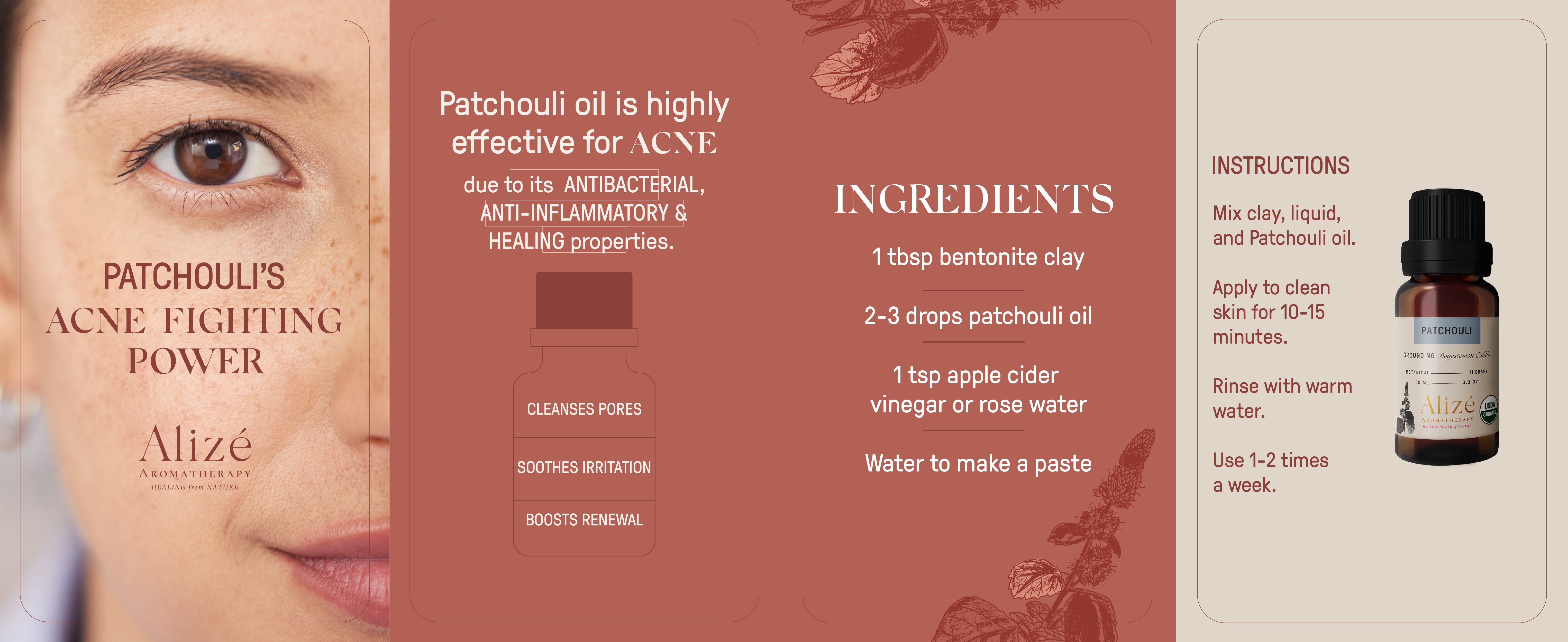Patchouli oil gently cleanses pores, helps reduce acne breakouts, soothes skin irritation, and supports natural renewal for a clearer, healthier complexion